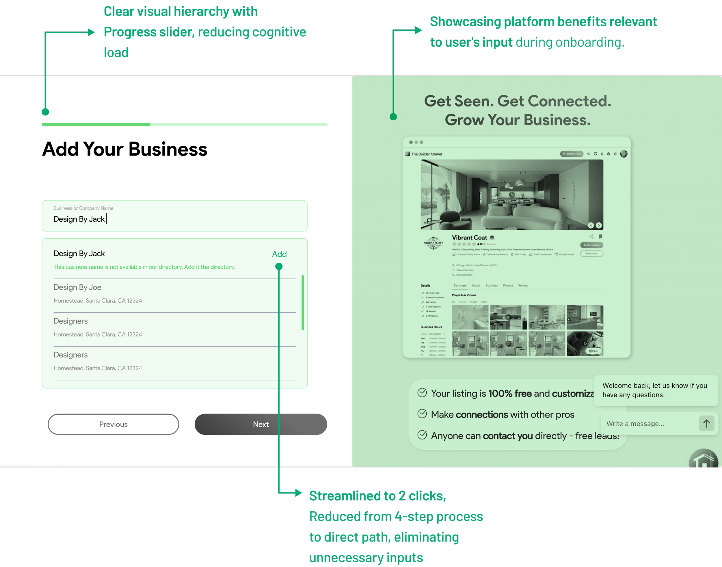 This allows users to experience Builder Market's value firsthand upon landing (on dashboard), motivating them to complete their full listing.