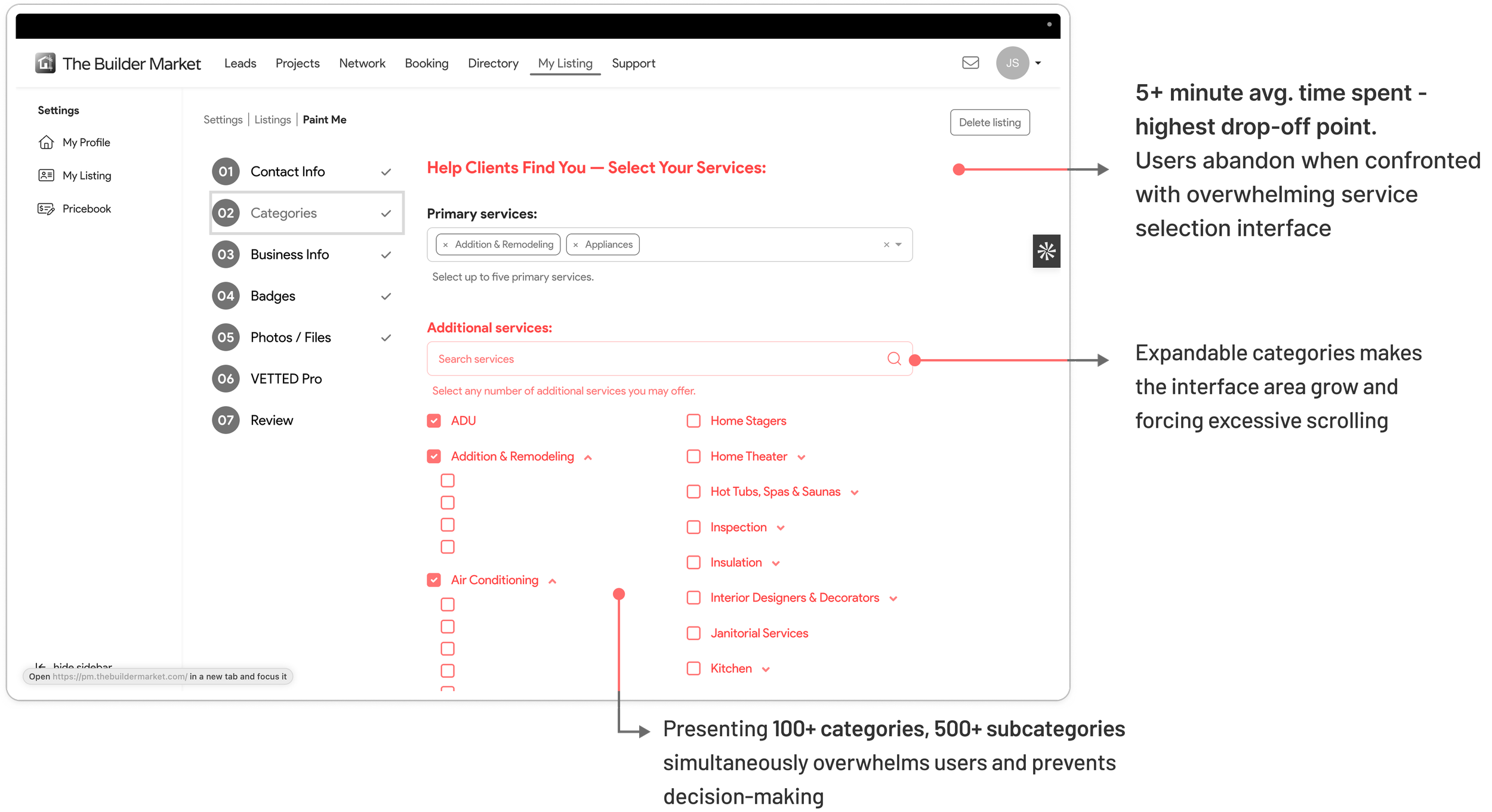 Builder Market allowed professionals to add comprehensive service offerings, but the flat hierarchy of services created decision paralysis.