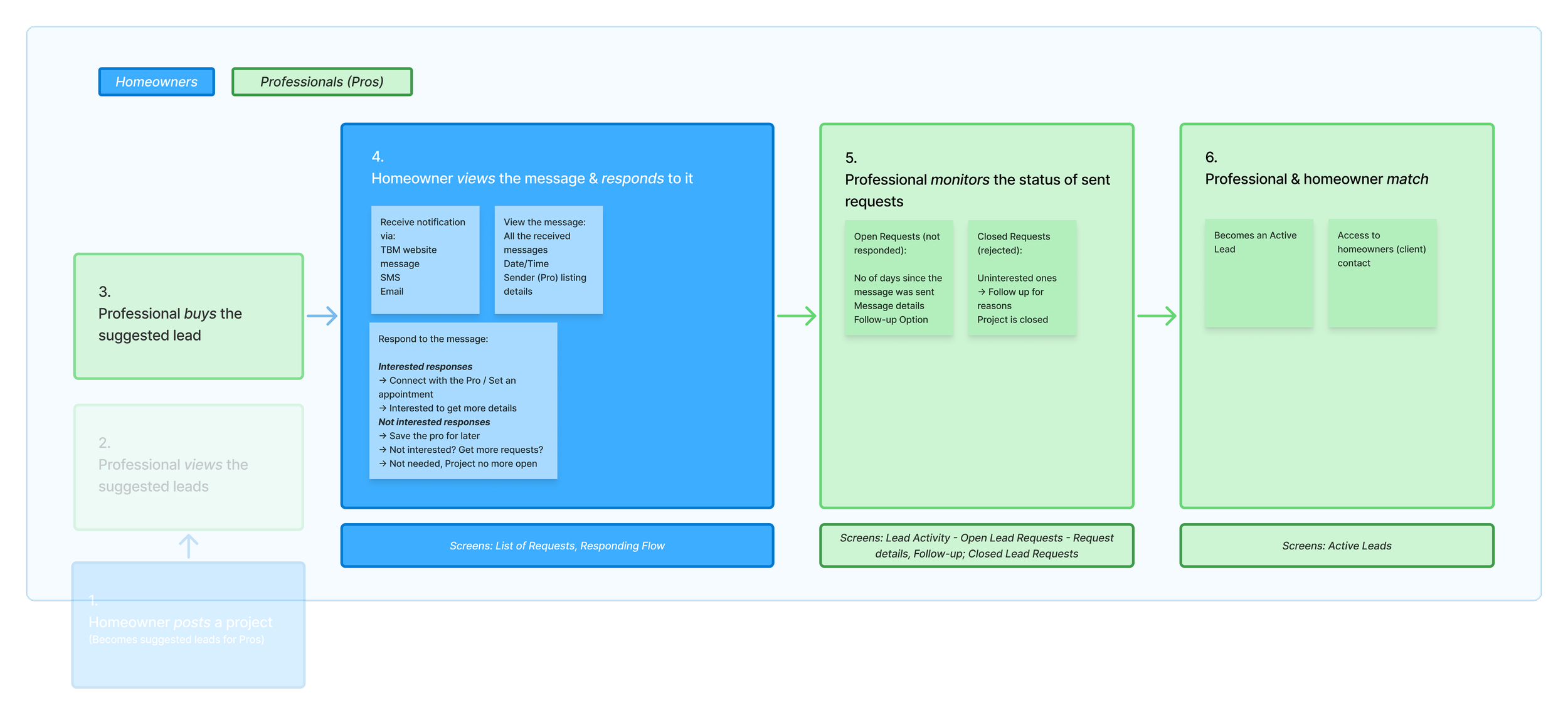 We redesigned the onboarding experience to front-load value demonstration and reduce user resistance, and designed a new system that allows professionals to purchase and contact leads while protecting homeowners from bombardment.
